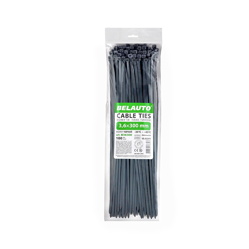 Пластикові стяжки чорного кольору 3.6x300 мм BelAuto артикул B36300 (B36300)